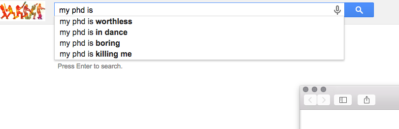 Other than the rather fun suggestion about a PhD in dance, the three options Google chooses to autocomplete this sentence with are negative: ‘worthless’, ‘boring’, ‘killing me’. The options Google selected are based (if I understand how this works accurately) on how many times people have typed these words into Google to search for resources or help. Why are so many PhD experiences (if this snapshot is any kind of indication) so negative? Why is the PhD more often than not framed as a long, arduous, lonely trudge, as opposed to a challenging, stimulating and ultimately empowering thing? Why is there not, in the more popular discourses around PhD study, more of an emphasis on what the PhD offers a scholar; the ups rather than the downs? People have done research that answers some of these questions, and I’d like to use this post to offer some of my thoughts on why this might be.
