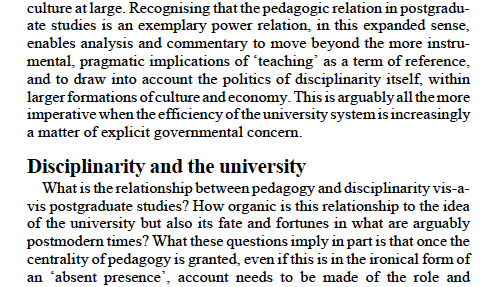 And here: they introduce the notion of the ‘politics of disciplinarity’ in the text, along with the ‘university system’ and then show with the sub-heading that they are moving forward to elaborate on these issues in the next section of the paper.