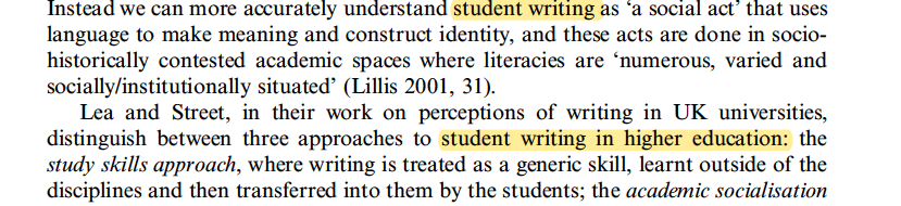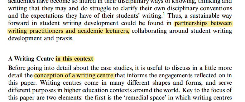 See how these writers have used the term ‘bridge’ in the text, and then again in the sub-heading. And, how they have connected this idea of a bridge to disciplinary knowledge structures. This term, in a different way, is then repeated under the sub-heading, and the effect for the reader is to see, without being told in a sentence that starts with ‘The next section will …’, that they are going to read about what the writer thinks this bridge is, and how it is connected to knowledge in the disciplines. The value of trying to use repetition, carefully, to build connections between ideas, as well as complexity of ideas, over the course of a paper, is that you show the reader what your argument is (and why it is useful), rather than telling them what it is. This is a more reader-friendly approach, and more likely to engage the readers with the argument itself, than with the way the argument is structured.